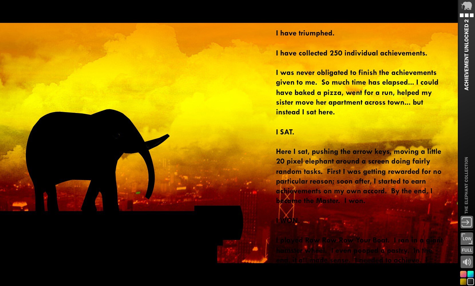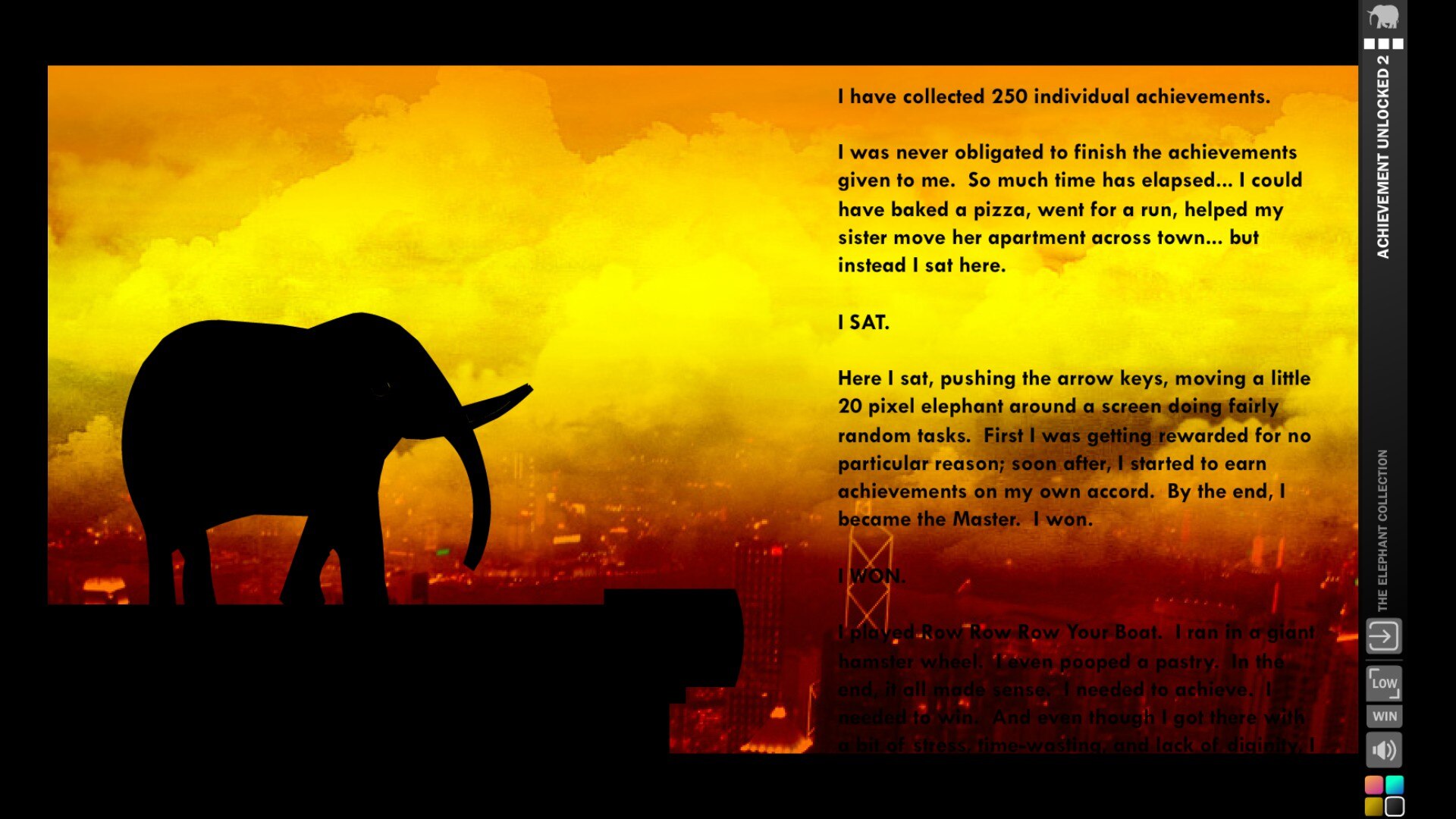 "The Elephant Collection" - это сборник приключенческих экшенов, включающий десять ремастированных классических игр от разработчика jmtb02 с участием культового синего слона из эпохи флэш-игры Armor Games. В сборник вошли полная трилогия "This is the Only Level" (где один уровень постоянно меняет свои правила), серия "Achievement Unlocked" (ориентированная на выполнение сотен мета-достижений) и "Elephant Quest" (обширное приключение, в котором вы расстреливаете врагов лазером, чтобы вернуть украденную шляпу-котелок). Другие игры, например "Obey! the Game", предлагают быстро пройти микроигру, в то время как "Run, Elephant, Run" заставляет вас бежать от глобальных туров за слоновьей романтикой, а "Elephant Rave" проверяет ваши навыки уворачивания от лазеров. Новый всеобъемлющий сюжет связывает все воедино: забывчивый слон должен восстановить свои воспоминания, зарабатывая свежие достижения во всех играх, создавая мета-прогрессивную систему, в которой вы открываете достижения за то, что открываете достижения. Ремастер включает в себя обновленные иллюстрации, поддерживающие более высокие разрешения, улучшенное качество звука по сравнению с оригинальными сжатыми веб-версиями, а также удаление рекламы для более плавного игрового процесса. В сборник вошли платформеры-головоломки, аркадные экшены и охота за достижениями, которые варьируются от напрягающих мозг до абсурдно-безумных. Обратите внимание, что сборник содержит мигающие огоньки, которые могут повлиять на светочувствительных игроков.