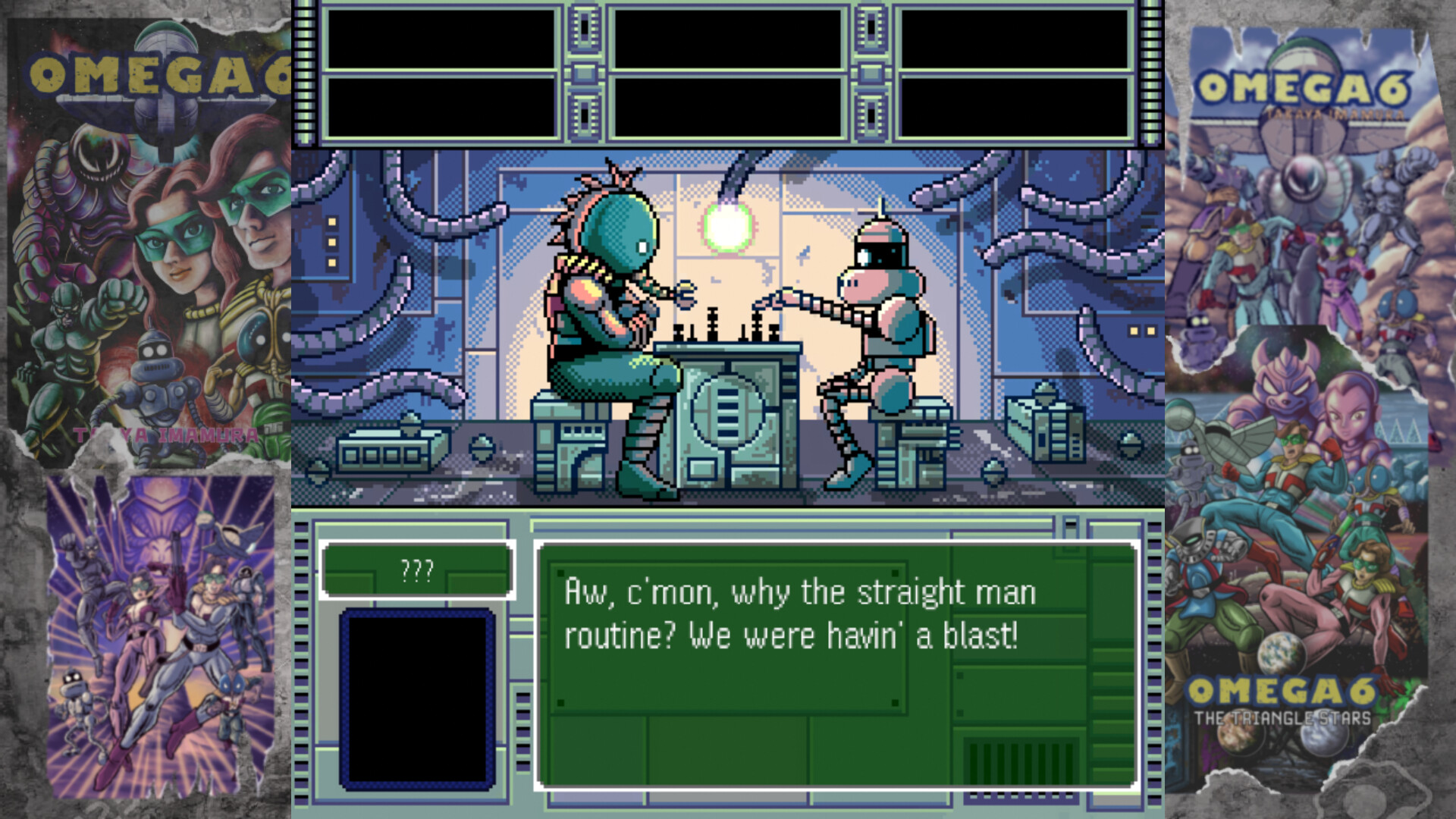 "OMEGA 6 The Triangle Stars" - это 16-битная приключенческая игра с элементами RPG, созданная бывшим арт-директором Nintendo Такайей Имамурой и разработчиками Happymeal. Вы играете за Грома и Кайлу, двух андроидов на борту космического корабля "Омега 6", которым поручено найти новую планету для человечества, а также разыскать сокровища, чтобы выплатить планетарный кредит. Квест охватывает три разных мира: Импостар (наполненный разнообразными инопланетянами), Игни (суровая огненная планета) и Фрослара (замороженный мир, населенный богатыми жителями).