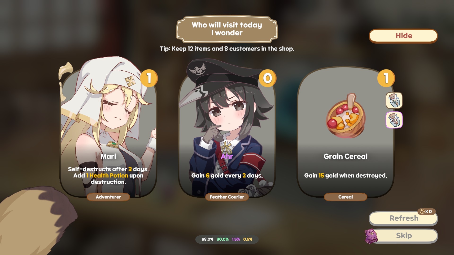 "Hayo and the Emporium" — это казуальная инди-стратегия, где вы играете за лиса Хайо, которому поручено управлять небольшим магазином, пока его владелец ищет сокровища. Ваша цель — успешно развивать этот магазин, стратегически размещая предметы и покупателей на компактной сетке 5x4, состоящей из 20 клеток. Геймплей построен вокруг размещения связанных предметов рядом с покупателями, чтобы заработать бонусное золото и активировать особые эффекты, создавая синергии, которые открывают скрытые пасхалки. Каждый бизнес-цикл приносит новых покупателей и предметы, требуя от вас принятия тактических решений, формирующих ваш уникальный магазин. Вам нужно будет достигать целевых показателей прибыли после каждого закрытия или столкнуться с банкротством, что добавляет остроты вашим выборам. В игре есть бард, который делится бродячими историями, добавляя нарративный колорит к происходящему. Успех зависит от тщательного пространственного планирования и понимания взаимосвязей между покупателями и предметами, поскольку и те, и другие появляются непредсказуемо при открытии магазина. Эта компактная стратегическая игра сочетает управление ресурсами с головоломными механиками расстановки плиток. Это беззаботное испытание, цель которого — удержать на плаву причудливый магазинчик с помощью умных решений и открытия комбинаций карт.