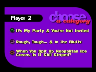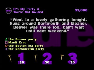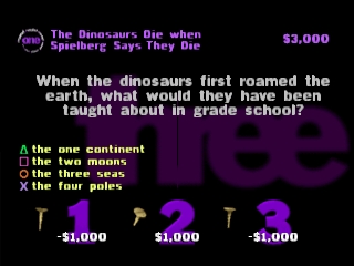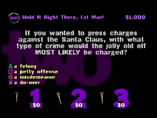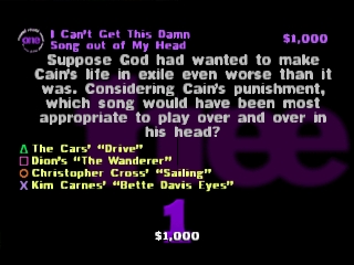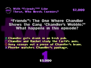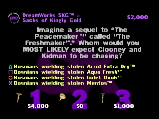 Чтобы ответить на вопрос, вам нужно зайти в игру и выбрать соответствующий вариант, обозначенный символами на кнопках контроллера. В зависимости от ценности вопроса правильный ответ принесет игроку от 1 000 до 6 000 долларов, а неправильный ответ вычтет эту сумму из заработанной (и наградит вас приятным шоком от аналогового контроллера Dual Shock). В многопользовательской игре вы можете "закрутить" соперника, если считаете, что он не знает правильного ответа, заставив его ответить на вопрос. Будьте осторожны с "винтами": хотя шансы могут быть в вашу пользу, правильный ответ награждает вашего противника и в равной степени наказывает вас. Также не удивляйтесь, если ведущий заставит вас отвечать на вопрос, если никто не хочет этого делать, а вы уверенно лидируете.